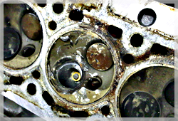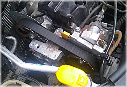 Your Renault vehicles engine, be it a petrol or diesel variant will at some point require routine Renault maintenance. It will have a “timing belt”. The sole purpose of the “timing belt”, also known as a “cam-belt”, is to provide a connection and drive between the camshaft(s) and crankshaft ensuring that the pistons and valves operate in the correct sequence and at precisely the correct time. The “timing belt” is not to be confused with the “auxiliary belt” which is located on the outside of the engines cases and drives the vehicles accessory systems such as power steering, air conditioning compressor, water pump, etc and they require frequent replacement. Like most drive belts, the “timing belt” and its associated components have a finite life span and whilst Renault do issue recommended guidelines on how long they should last for they are just a recommendation and there are no definitive black and white timescales to how long a belt and associated components will last for. At present Renault UK recommends that most modern engines have the timing belt kit serviced in its entirety and be changed at either 72,000 miles or after 5 years (which ever milestone is reached by your vehicle first, not which is more convenient to you). In some cases your vehicle may start making an odd ‘ticking’ noise that seems to increase in speed as the engine revs increase however there are usually no indications of impending timing belt failure as the material simply rips or snaps while you are driving leaving you stranded at the roadside waiting for recovery. Other causes can be premature wear or failure of the water pump drive bearing and seals which causes the driving sprocket to seize up or even snap off. Normally, when they seize up the timing belts driving face is stripped of the drive teeth eventually causing it to slip so the valves and pistons meet at great speed and with force… the end result is not pretty (See images below).